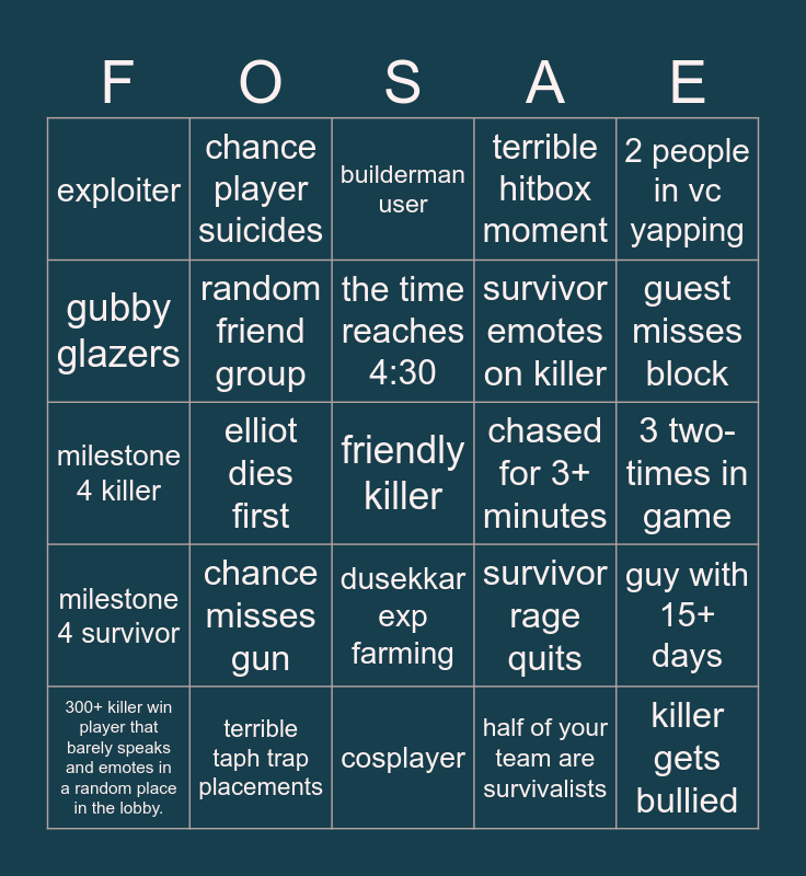 This bingo card has 28 words: 300+ killer win player that barely speaks and emotes in a random place in the lobby., killer rage quits, the time reaches 4:30, half of your team are survivalists, 2 people in vc yapping, gubby glazers, chance player suicides, dusekkar exp farming, chased for 3+ minutes, killer gets bullied, milestone 4 killer, random friend group, cosplayer, survivor rage quits, guest misses block, shedlesky misses sword, chance misses gun, builderman user, terrible hitbox moment, guy with 15+ days, exploiter, terrible taph trap placements, friendly killer, survivor emotes on killer, 3 two-times in game, milestone 4 survivor, elliot dies first and toxicity in chat.