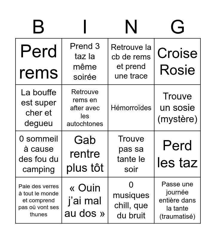 This bingo card has 16 words: « Ouin j’ai mal au dos », Perd les taz, Retrouve la cb de rems et prend une trace, Perd rems, 0 sommeil à cause des fou du camping, Prend 3 taz la même soirée, Trouve pas sa tante le soir, 0 musiques chill, que du bruit, La bouffe est super cher et degueu, Retrouve rems en after avec les autochtones, Paie des verres à tout le monde et comprend pas où vont ses thunes, Croise Rosie, Gab rentre plus tôt, Trouve un sosie (mystère), Hémorroïdes and Passe une journée entière dans la tante (traumatisé).
