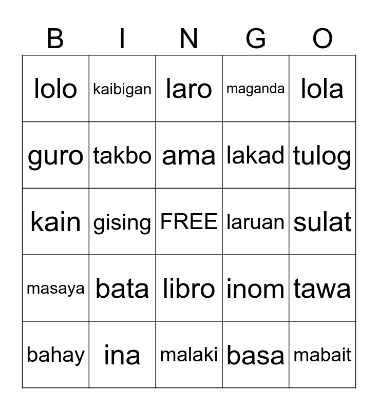 This bingo card has a free space and 24 words: bata, ina, ama, bahay, lola, lolo, guro, kaibigan, laruan, libro, lakad, kain, inom, tawa, takbo, basa, sulat, laro, tulog, gising, mabait, masaya, maganda and malaki.