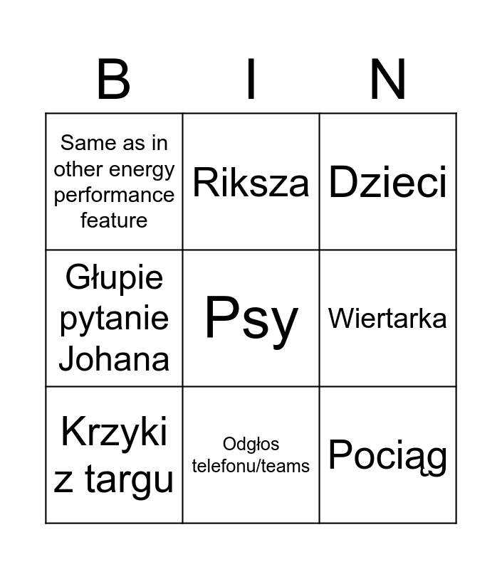This bingo card has a free space and 8 words: Wiertarka, Dzieci, Riksza, Krzyki z targu, Same as in other energy performance feature, Pociąg, Głupie pytanie Johana and Odgłos telefonu/teams.