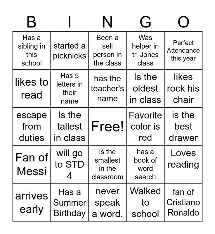 This bingo card has a free space and 24 words: will go to STD 4, Has a Summer Birthday, has the teacher's name, arrives early, Perfect Attendance this year, Has a sibling in this school, likes to read, started a picknicks, Favorite color is red, is the smallest in the classroom, Is the oldest in class, escape from duties, has a book of word search, Loves reading, Has 5 letters in their name, Walked to school, is the best drawer, Been a sell person in the class, likes rock his chair, Is the tallest in class, fan of Cristiano Ronaldo, Fan of Messi, Was helper in tr. Jones class and never speak a word..