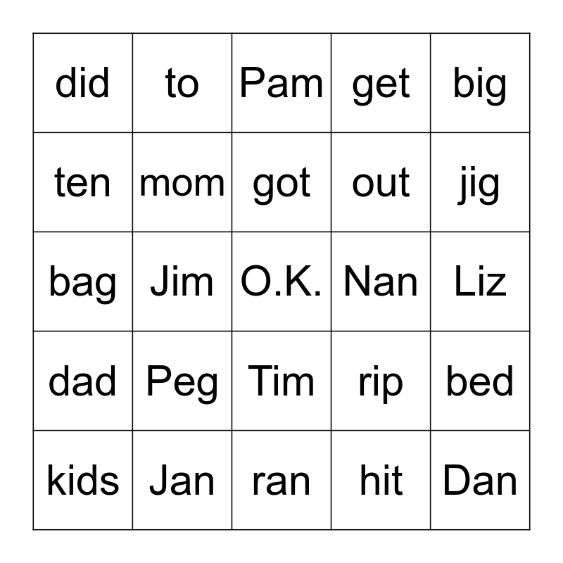 This bingo card has a free space and 29 words: kids, Don, Jim, Tom, did, Pam, mom, Peg, Nan, Jan, Liz, Dan, ran, hit, jig, hid, Tim, dad, big, bag, rip, saw, out, ten, get, to, bed, got and of.