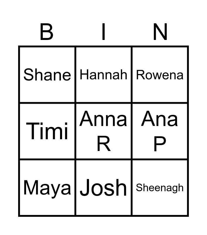 This bingo card has 18 words: Karl, Ella, Rowena, Shane, Free!, Timi, Myia F, Hannah, Josh, Sheenagh, Lauren, Anna R, Aoife, Ana P, Maya, Roisin, Eimear and Kate.