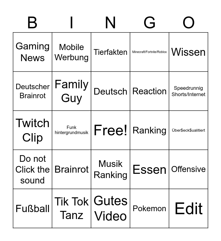 This bingo card has a free space and 24 words: Brainrot, Tik Tok Tanz, Deutsch, Fußball, Wissen, Gaming News, Deutscher Brainrot, Mobile Werbung, Ranking, Musik Ranking, Reaction, Twitch Clip, Essen, Offensive, Family Guy, Pokemon, Über$eck$ualitiert, Tierfakten, Speedrunnig Shorts/Internet, Funk hintergrundmusik, Edit, Do not Click the sound, Minecraft/Fortnite/Roblox and Gutes Video.