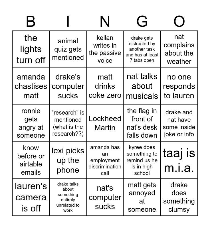 This bingo card has a free space and 24 words: lexi picks up the phone, drake talks about something entirely unrelated to work, matt drinks coke zero, lauren's camera is off, nat complains about the weather, the lights turn off, amanda chastises matt, animal quiz gets mentioned, the flag in front of nat's desk falls down, amanda has an employment discrimination call, nat talks about musicals, ronnie gets angry at someone, kyree does something to remind us he is in high school, taaj is m.i.a., drake's computer sucks, matt gets annoyed at someone, drake and nat have some inside joke or info, kellan writes in the passive voice, no one responds to lauren, "research" is mentioned (what is the research??), drake does something clumsy, know before or airtable emails, drake gets distracted by another task and has at least 7 tabs open and nat's computer sucks.