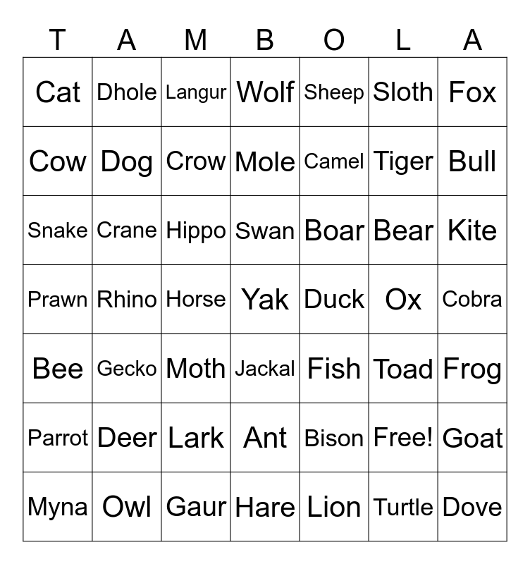 This bingo card has 49 words: Free!, Tiger, Lion, Rhino, Hippo, Cobra, Dhole, Gaur, Sloth, Jackal, Fox, Wolf, Bear, Boar, Deer, Ox, Cow, Bull, Goat, Sheep, Camel, Horse, Cat, Dog, Myna, Crow, Kite, Owl, Swan, Crane, Dove, Duck, Parrot, Lark, Prawn, Fish, Toad, Frog, Snake, Moth, Ant, Bee, Yak, Hare, Mole, Langur, Bison, Gecko and Turtle.