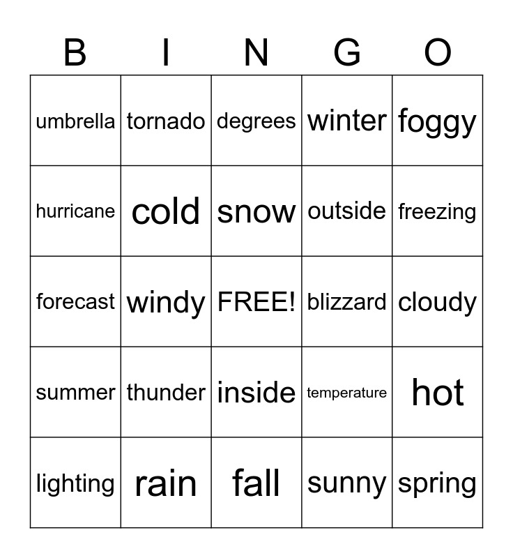 This bingo card has a free space and 24 words: thunder, rain, snow, lighting, foggy, umbrella, hurricane, tornado, blizzard, inside, outside, forecast, temperature, hot, cold, sunny, cloudy, degrees, freezing, windy, spring, summer, winter and fall.