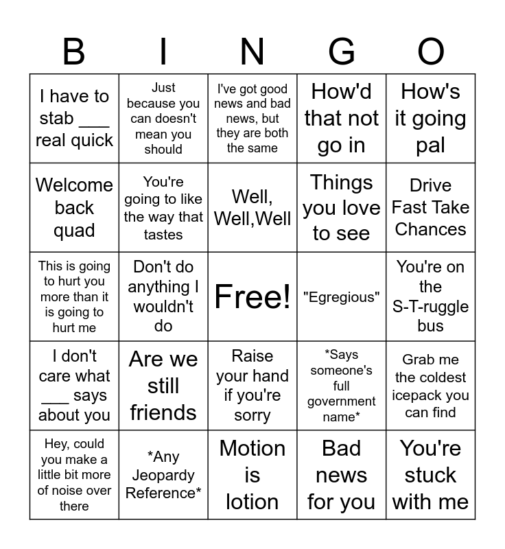 This bingo card has a free space and 24 words: Are we still friends, *Any Jeopardy Reference*, Well, Well,Well, Hey, could you make a little bit more of noise over there, How's it going pal, I have to stab ___ real quick, Welcome back quad, Just because you can doesn't mean you should, "Egregious", Raise your hand if you're sorry, Things you love to see, This is going to hurt you more than it is going to hurt me, *Says someone's full government name*, Grab me the coldest icepack you can find, You're going to like the way that tastes, Bad news for you, You're on the S-T-ruggle bus, I've got good news and bad news, but they are both the same, Drive Fast Take Chances, Don't do anything I wouldn't do, You're stuck with me, I don't care what ___ says about you, How'd that not go in and Motion is lotion.