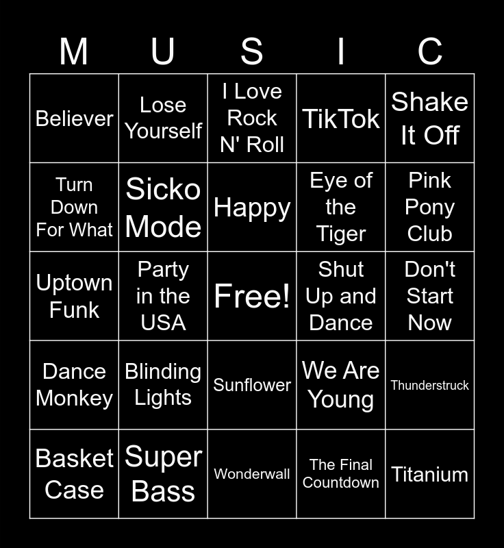 This bingo card has a free space and 40 words: All I Do Is Win, Uptown Funk, Can't Hold Us, Sicko Mode, Super Bass, Sunflower, Happy, Levitating, Shake It Off, Dance Monkey, Party in the USA, TikTok, Titanium, Don't Start Now, Shut Up and Dance, Blinding Lights, Yeah!, Believer, We Will Rock You, I Love Rock N' Roll, Thunderstruck, The Final Countdown, Eye of the Tiger, Turn Down For What, The Monster, Umbrella, Roar, Timber, Can't Stop the Feeling, Old Town Road, Butter, Basket Case, Feel Again, We Are Young, Pink Pony Club, Wonderwall, I Gotta Feeling, Californication, Lose Yourself and School's Out.