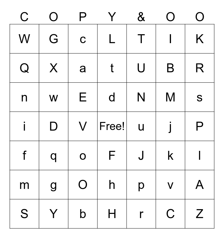 This bingo card has a free space and 50 words: A, B, C, D, E, F, G, H, I, J, K, L, M, N, O, P, Q, R, S, T, U, V, W, X, Y, Z, a, b, c, d, e, f, g, h, i, j, k, l, m, n, o, p, q, r, s, t, u, v, w and y.