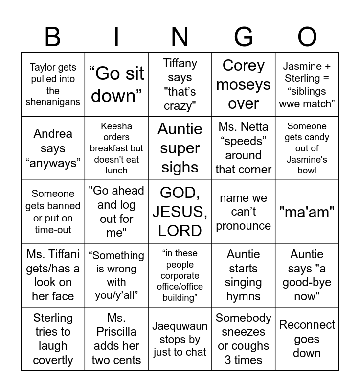 This bingo card has a free space and 24 words: “Something is wrong with you/y’all”, Ms. Priscilla adds her two cents, Auntie super sighs, Sterling tries to laugh covertly, Jasmine + Sterling = “siblings wwe match”, Taylor gets pulled into the shenanigans, Andrea says “anyways”, “Go sit down”, name we can’t pronounce, “in these people corporate office/office building”, Ms. Netta “speeds” around that corner, Someone gets banned or put on time-out, Auntie starts singing hymns, Auntie says "a good-bye now", Keesha orders breakfast but doesn't eat lunch, Somebody sneezes or coughs 3 times, "ma'am", Tiffany says "that’s crazy", Someone gets candy out of Jasmine's bowl, "Go ahead and log out for me", Reconnect goes down, Ms. Tiffani gets/has a look on her face, Corey moseys over and Jaequwaun stops by just to chat.