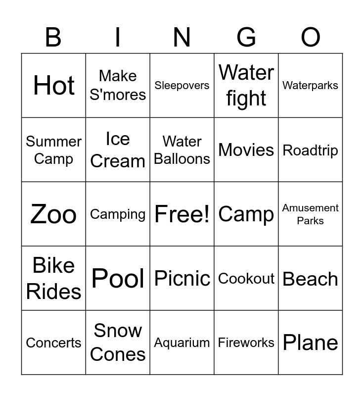 This bingo card has a free space and 24 words: Pool, Snow Cones, Water Balloons, Concerts, Waterparks, Hot, Summer Camp, Make S'mores, Camp, Picnic, Movies, Zoo, Cookout, Beach, Ice Cream, Fireworks, Amusement Parks, Sleepovers, Roadtrip, Camping, Plane, Bike Rides, Water fight and Aquarium.