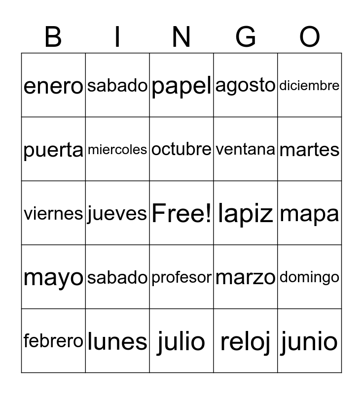 This bingo card has a free space and 29 words: febrero, silla, jueves, escritorio, enero, papel, miercoles, sabado, lapiz, lunes, mapa, junio, julio, reloj, martes, estudiante, profesor, mayo, diciembre, viernes, marzo, abril, ventana, puerta, agosto, sabado, domingo, octubre and libro.
