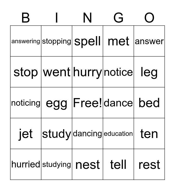This bingo card has a free space and 24 words: study, studying, hurry, hurried, answer, answering, stop, stopping, dance, dancing, notice, noticing, education, ten, went, tell, bed, spell, leg, egg, rest, jet, met and nest.