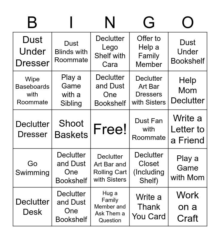 This bingo card has a free space and 24 words: Declutter and Dust One Bookshelf, Declutter and Dust One Bookshelf, Declutter and Dust One Bookshelf, Declutter Desk, Dust Under Bookshelf, Dust Under Dresser, Wipe Baseboards with Roommate, Dust Blinds with Roommate, Dust Fan with Roommate, Declutter Art Bar and Rolling Cart with Sisters, Declutter Art Bar Dressers with Sisters, Declutter Dresser, Declutter Closet (Including Shelf), Play a Game with Mom, Play a Game with a Sibling, Write a Thank You Card, Write a Letter to a Friend, Declutter Lego Shelf with Cara, Help Mom Declutter, Shoot Baskets, Work on a Craft, Go Swimming, Offer to Help a Family Member and Hug a Family Member and Ask Them a Question.