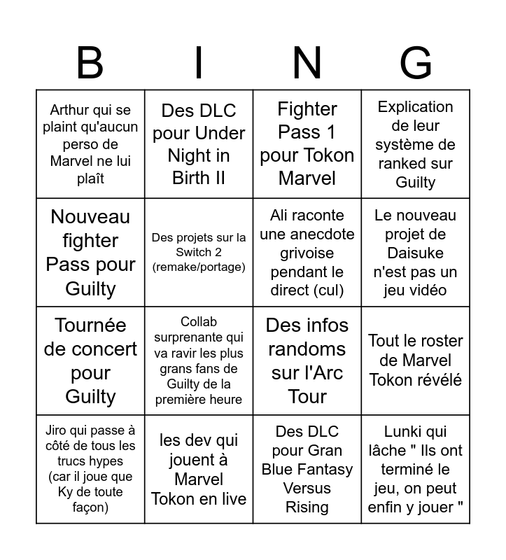 This bingo card has 16 words: les dev qui jouent à Marvel Tokon en live, Tout le roster de Marvel Tokon révélé, Fighter Pass 1 pour Tokon Marvel, Arthur qui se plaint qu'aucun perso de Marvel ne lui plaît, Tournée de concert pour Guilty, Des DLC pour Under Night in Birth II, Des infos randoms sur l'Arc Tour, Des DLC pour Gran Blue Fantasy Versus Rising, Nouveau fighter Pass pour Guilty, Des projets sur la Switch 2 (remake/portage), Jiro qui passe à côté de tous les trucs hypes (car il joue que Ky de toute façon), Explication de leur système de ranked sur Guilty, Collab surprenante qui va ravir les plus grans fans de Guilty de la première heure, Le nouveau projet de Daisuke n'est pas un jeu vidéo, Ali raconte une anecdote grivoise pendant le direct (cul) and Lunki qui lâche " Ils ont terminé le jeu, on peut enfin y jouer ".