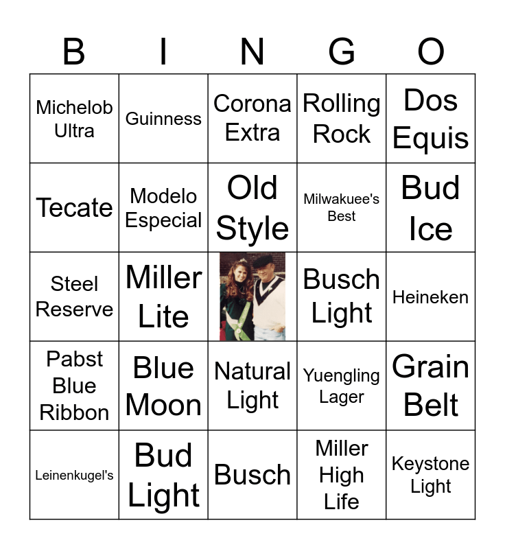 This bingo card has a free space and 30 words: Bud Light, Coors Light, Miller Lite, Budweiser, Michelob Ultra, Corona Extra, Modelo Especial, Natural Light, Busch Light, Busch, Heineken, Keystone Light, Miller High Life, Stella Artois, Bud Ice, Natural Ice, Yuengling Lager, Pabst Blue Ribbon, Blue Moon, Dos Equis, Steel Reserve, Icehouse, Guinness, Milwakuee's Best, Tecate, Rolling Rock, Grain Belt, Leinenkugel's, Old Style and Hamm's.