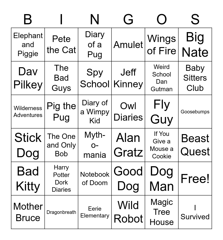 This bingo card has 38 words: Free!, Dog Man, I Survived, Dav Pilkey, The One and Only Bob, Fly Guy, The Bad Guys, Magic Tree House, Wings of Fire, Spy School, Baby Sitters Club, Amulet, Wilderness Adventures, Diary of a Wimpy Kid, Big Nate, Owl Diaries, Notebook of Doom, Diary of a Pug, Dragonbreath, Pig the Pug, Elephant and Piggie, Alan Gratz, Jeff Kinney, Myth-o-mania, Eerie Elementary, If You Give a Mouse a Cookie, Bad Kitty, Wild Robot, Mother Bruce, Good Dog, Press Start, Goosebumps, Beast Quest, Pete the Cat, Harry Potter Dork Diaries, Stick Dog, Weird School Dan Gutman and Last Kids On Earth.