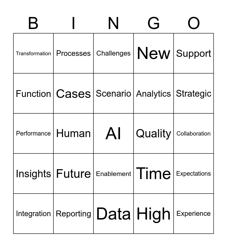 This bingo card has 48 words: Free!, AI, Finance, Data, Future, Use, Processes, Skills, Function, Automation, Cases, New, Expectations, Time, Organization, CFO, Scenario, Quality, Savings, Support, Human, High, Transformation, Analytics, Decision, Strategic, Integration, Technology, Enablement, Insights, Planning, Automation, Modeling, Innovation, Reporting, Change, Leadership, Collaboration, Digital, Productivity, Intelligence, Experience, Challenges, Roadmap, Performance, Learning, Governance and Strategy.