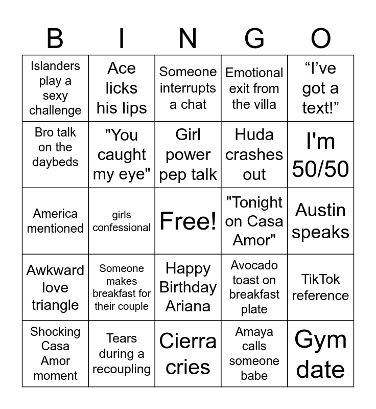 This bingo card has a free space and 24 words: Someone makes breakfast for their couple, Tears during a recoupling, Girl power pep talk, Shocking Casa Amor moment, “I’ve got a text!”, Islanders play a sexy challenge, Bro talk on the daybeds, Ace licks his lips, "Tonight on Casa Amor", Happy Birthday Ariana, Huda crashes out, America mentioned, Avocado toast on breakfast plate, TikTok reference, "You caught my eye", Amaya calls someone babe, Austin speaks, Someone interrupts a chat, I'm 50/50, girls confessional, Gym date, Awkward love triangle, Emotional exit from the villa and Cierra cries.