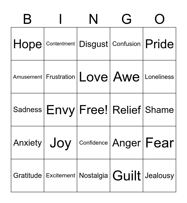 This bingo card has a free space and 24 words: Joy, Excitement, Love, Gratitude, Pride, Hope, Amusement, Contentment, Relief, Confidence, Awe, Sadness, Anger, Fear, Frustration, Guilt, Shame, Disgust, Loneliness, Envy, Jealousy, Anxiety, Confusion and Nostalgia.