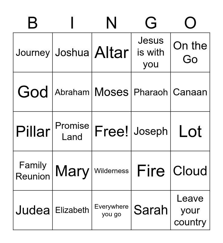 This bingo card has a free space and 24 words: Mary, Elizabeth, Moses, Judea, On the Go, Journey, God, Joshua, Joseph, Wilderness, Pharaoh, Pillar, Fire, Cloud, Abraham, Sarah, Lot, Altar, Canaan, Promise Land, Leave your country, Family Reunion, Jesus is with you and Everywhere you go.