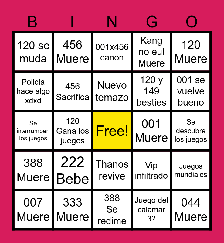This bingo card has a free space and 24 words: 007 Muere, 222 Bebe, Nuevo temazo, Juego del calamar 3?, 120 Muere, 120 se muda, 456 Muere, 001x456 canon, 001 Muere, Se descubre los juegos, Se interrumpen los juegos, 456 Sacrifica, Vip infiltrado, Juegos mundiales, Policía hace algo xdxd, 333 Muere, 388 Se redime, Kang no eul Muere, 001 se vuelve bueno, 388 Muere, 120 Gana los juegos, Thanos revive, 120 y 149 besties and 044 Muere.