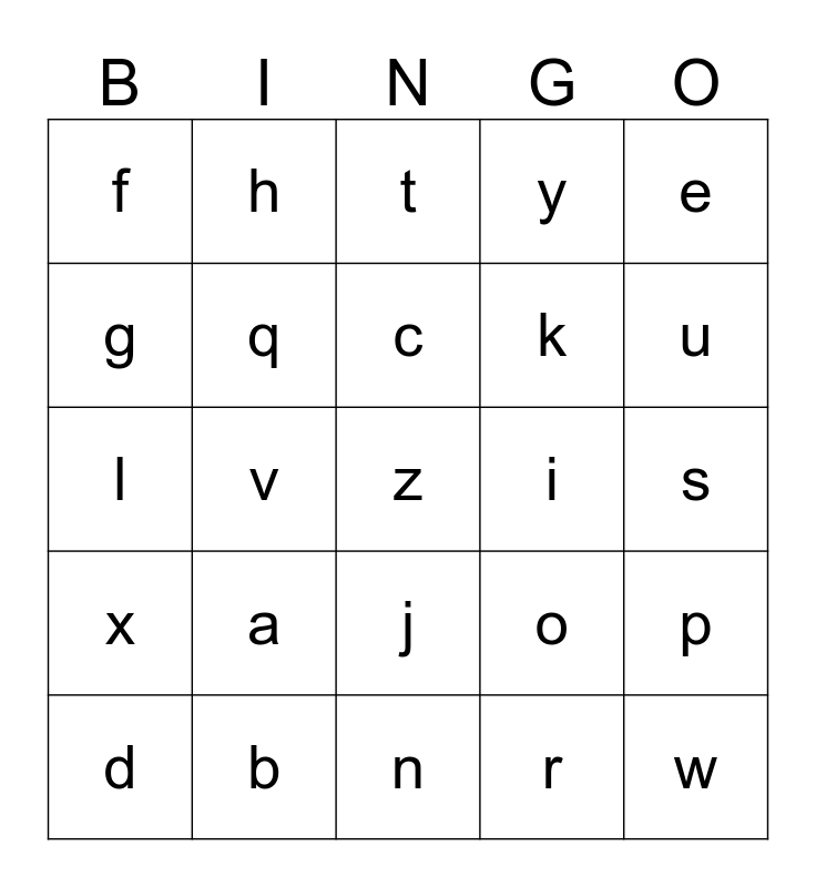 This bingo card has a free space and 24 words: a, b, c, d, e, f, g, h, i, j, k, l, o, p, q, r, s, t, u, v, w, x, y and n.