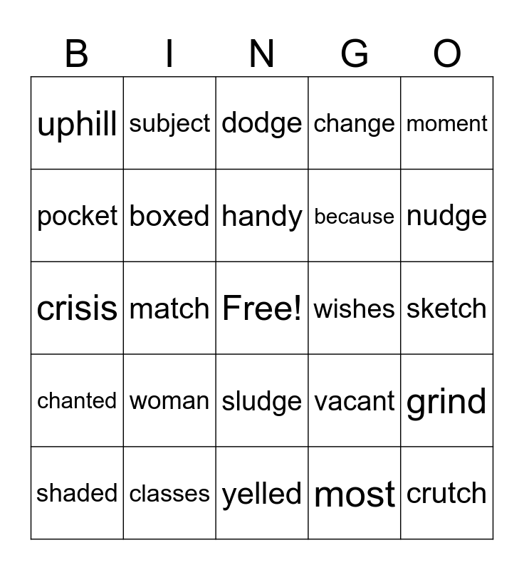 This bingo card has a free space and 42 words: angry, handy, family, woman, most, grind, crutch, badge, dodge, sludge, sketch, nudge, match, moment, program, vacant, human, crisis, helmet, subject, pocket, distant, sentence, uphill, drumstick, itself, because, clump, smashing, been, flashing, chanted, boxed, yelled, melted, shaded, classes, wishes, taxes, live, change and made.