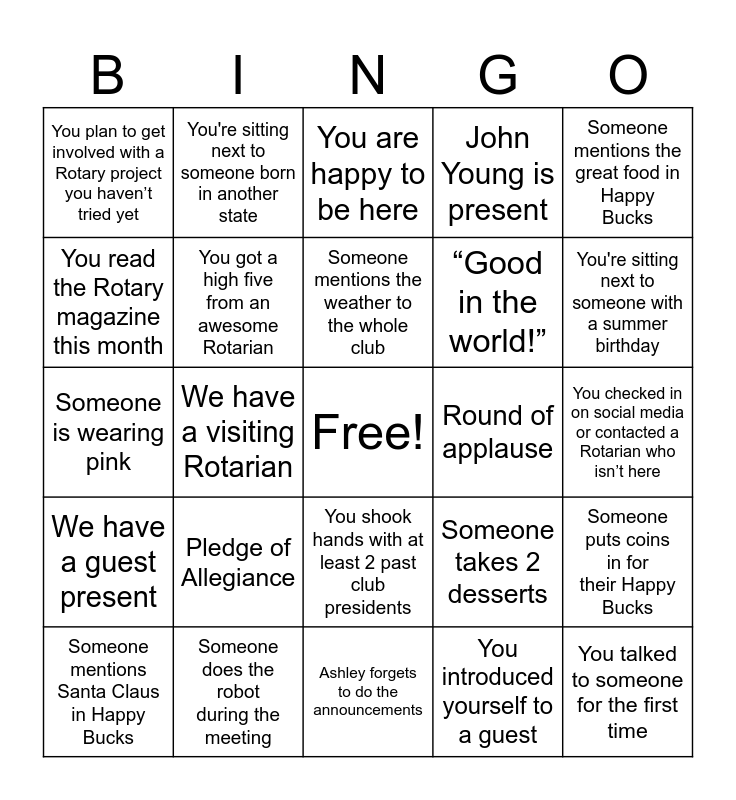 This bingo card has a free space and 30 words: You sit at a table you haven't sat at before, Someone does the robot during the meeting, You are happy to be here, “You may be seated”, Someone mentions the great food in Happy Bucks, You plan to get involved with a Rotary project you haven’t tried yet, You got a high five from an awesome Rotarian, Someone mentions the weather to the whole club, “Good in the world!”, You talked to someone for the first time, Someone mentions Santa Claus in Happy Bucks, Pledge of Allegiance, You introduced yourself to a guest, Someone comes in late, We have a guest present, Matt Dean does HappyBucks, Ashley forgets to do the announcements, Round of applause, Someone puts coins in for their Happy Bucks, You read the Rotary magazine this month, We have a visiting Rotarian, Ashley remembers to do the announcements, John Young is present, You checked in on social media or contacted a Rotarian who isn’t here, Someone is wearing pink, You're sitting next to someone born in another state, You shook hands with at least 2 past club presidents, Someone takes 2 desserts, You're sitting next to someone with a summer birthday and Robi is present.