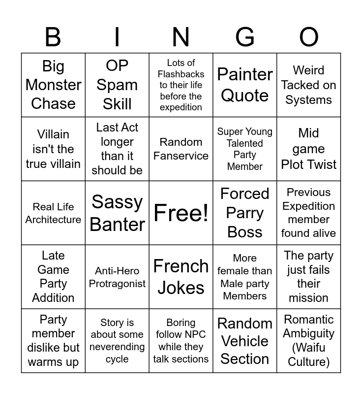 This bingo card has a free space and 24 words: Anti-Hero Protragonist, Story is about some neverending cycle, Random Fanservice, Party member dislike but warms up, Weird Tacked on Systems, Big Monster Chase, Villain isn't the true villain, OP Spam Skill, Forced Parry Boss, French Jokes, Super Young Talented Party Member, Real Life Architecture, More female than Male party Members, The party just fails their mission, Last Act longer than it should be, Random Vehicle Section, Previous Expedition member found alive, Lots of Flashbacks to their life before the expedition, Mid game Plot Twist, Sassy Banter, Romantic Ambiguity (Waifu Culture), Late Game Party Addition, Painter Quote and Boring follow NPC while they talk sections.