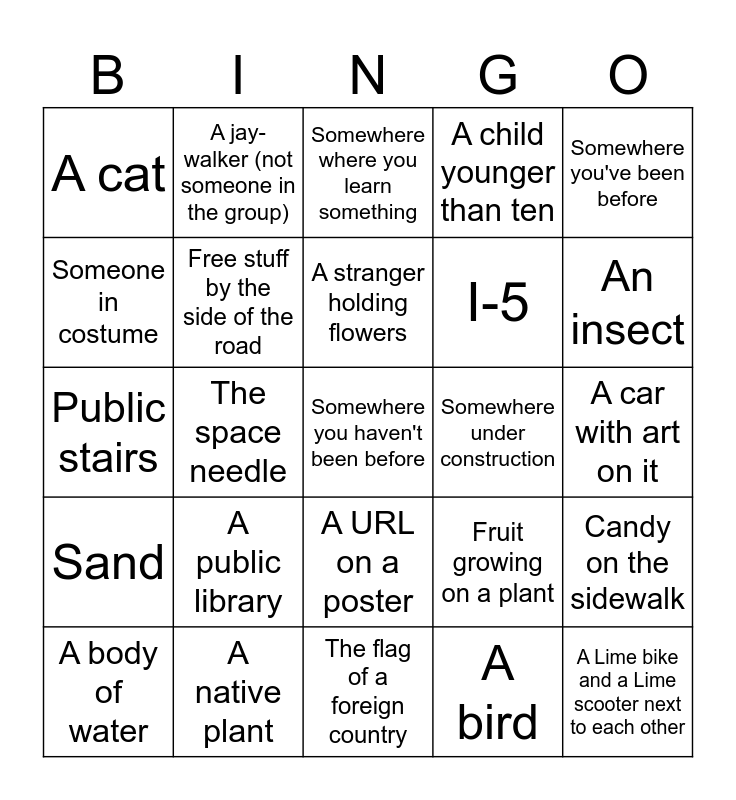 This bingo card has a free space and 29 words: A body of water, A side of a building with no windows, The space needle, A tree that is your height, A cat, Somewhere where you learn something, Free stuff by the side of the road, A public library, Somewhere under construction, A native plant, A car with art on it, A Lime bike and a Lime scooter next to each other, The flag of a foreign country, A bird, An insect, A statue, A URL on a poster, Sand, Somewhere you've been before, Public stairs, Fruit growing on a plant, A numbered street that's the same as your age, I-5, Someone in costume, A child younger than ten, A jay-walker (not someone in the group), Candy on the sidewalk, A stranger holding flowers and An instrument.