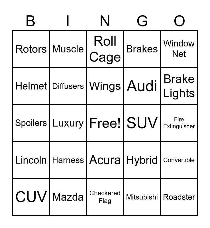 This bingo card has a free space and 80 words: Chassis, Suspension, Roll Cage, Bentley, Roll Bar, Engine, Transmission, Driveshaft, Axels, Differential, Wheels, Tires, Brakes, Rotors, Pads, Helmet, Race suit, Harness, Brake Cooling, Fire Extinguisher, HANS Device, Window Net, Spoilers, Wings, Diffusers, Steering, Cooling System, Electrical System, Windshield, Head Lights, Brake Lights, Seat Belt, Checkered Flag, Sedan, CUV, SUV, Hatback, MiniVan, Coupe, Roadster, Supercar, Pickup, Van, Limo, Open Wheel, Muscle, Sport, Off Roader, Hyper, Station Wagon, Convertible, Luxury, Hybrid, Jeep, Ford, GMC, Dodge, Nissan, Volkswagen, Acura, Audi, BMW, Buick, Cadillac, Chevy, Chrysler, Honda, Jaguar, KIA, Lexus, Lincoln, Mazda, Mercedes, Subaru, Tesla, Toyota, Mitsubishi, Porsche, Lamborghini and Maserati.