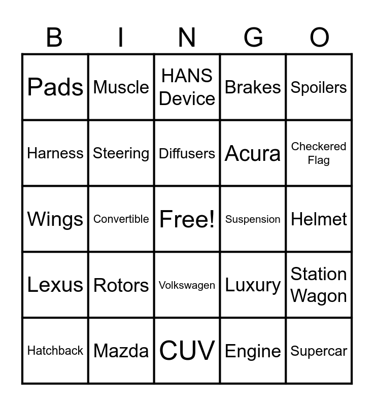 This bingo card has a free space and 80 words: Lincoln, Chassis, HANS Device, Bentley, Roll Bar, Transmission, Roll Cage, Driveshaft, Axels, Differential, Wheels, Tires, Brakes, Pads, Race suit, Harness, Brake Cooling, Rotors, Fire Extinguisher, Helmet, Window Net, Spoilers, Wings, Diffusers, Steering, Cooling System, Electrical System, Windshield, Head Lights, Brake Lights, Checkered Flag, Sedan, CUV, SUV, Hatchback, Suspension, Minivan, Coupe, Roadster, Supercar, Pickup, Van, Limo, Seat Belt, Open Wheel, Muscle, Sport, Porsche, Off Roader, Hyper, Station Wagon, Convertible, Luxury, Hybrid, Jeep, Ford, GMC, Dodge, Nissan, Volkswagen, Acura, Audi, BMW, Buick, Cadillac, Chevy, Chrysler, Honda, Jaguar, KIA, Lexus, Mazda, Mercedes, Subaru, Tesla, Toyota, Engine, Mitsubishi, Lamborghini and Maserati.