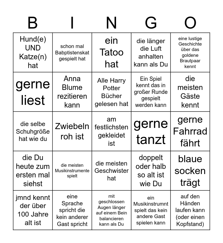 This bingo card has a free space and 24 words: die meisten Musikinstrumente spielt, eine Sprache spricht die kein anderer Gast spricht, Alle Harry Potter Bücher gelesen hat, jmnd kennt der über 100 Jahre alt ist, eine lustige Geschichte über das goldene Brautpaar kennt, Hund(e) UND Katze(n) hat, gerne liest, schon mal Babptistenskat gespielt hat, gerne tanzt, die meisten Geschwister hat, Ein Spiel kennt das in großer Runde gespielt werden kann, die selbe Schuhgröße hat wie du, doppelt oder halb so alt ist wie Du, blaue socken trägt, Anna Blume rezitieren kann, ein Musikinstrumnt spielt das kein andere Gast spielen kann, gerne Fahrrad fährt, ein Tatoo hat, die meisten Gäste kennt, Zwiebeln roh ist, auf den Händen laufen kann (oder einen Kopfstand), die Du heute zum ersten mal siehst, die länger die Luft anhalten kann als Du and mit geschlossen Augen länger auf einem Bein balancieren kann als Du.