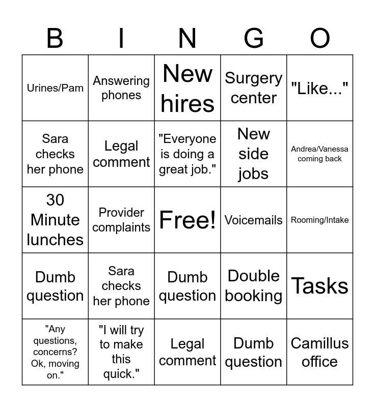 This bingo card has a free space and 24 words: Sara checks her phone, "I will try to make this quick.", "Everyone is doing a great job.", "Any questions, concerns? Ok, moving on.", "Like...", Urines/Pam, Sara checks her phone, Answering phones, Voicemails, Dumb question, New side jobs, 30 Minute lunches, Double booking, Tasks, Legal comment, Dumb question, Rooming/Intake, New hires, Andrea/Vanessa coming back, Provider complaints, Camillus office, Dumb question, Surgery center and Legal comment.