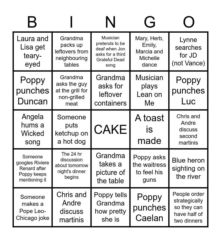 This bingo card has a free space and 24 words: The 24 hr discussion about tomorrow night's dinner begins, Chris and Andre discuss martinis, Grandma asks for leftover containers, Someone makes a Pope Leo-Chicago joke, Lynne searches for JD (not Vance), Laura and Lisa get teary-eyed, Poppy punches Duncan, Grandma packs up leftovers from neighbouring tables, A toast is made, Grandma takes a picture of the table, Musician plays Lean on Me, Angela hums a Wicked song, Poppy asks the waitress to feel his guns, Blue heron sighting on the river, Grandma asks the guy at the grill for non-grilled meat, Poppy punches Caelan, Chris and Andre discuss second martinis, Musician pretends to be deaf when Jon asks for a third Grateful Dead song, Poppy punches Luc, Someone puts ketchup on a hot dog, People order strategically so they can have half of two dinners, Someone googles Riviere Renard after Poppy keeps mentioning it, Mary, Herb, Emily, Marcia and Michelle dance and Poppy tells Grandma how pretty she is.