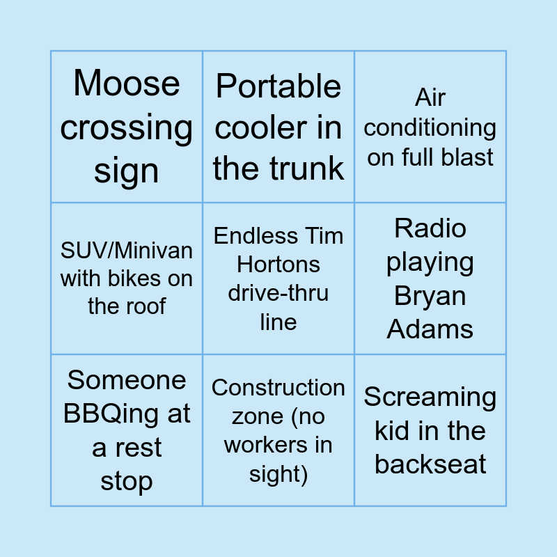 This bingo card has a free space and 8 words: Radio playing Bryan Adams, Air conditioning on full blast, Portable cooler in the trunk, Someone BBQing at a rest stop, Moose crossing sign, Screaming kid in the backseat, SUV/Minivan with bikes on the roof and Construction zone (no workers in sight).