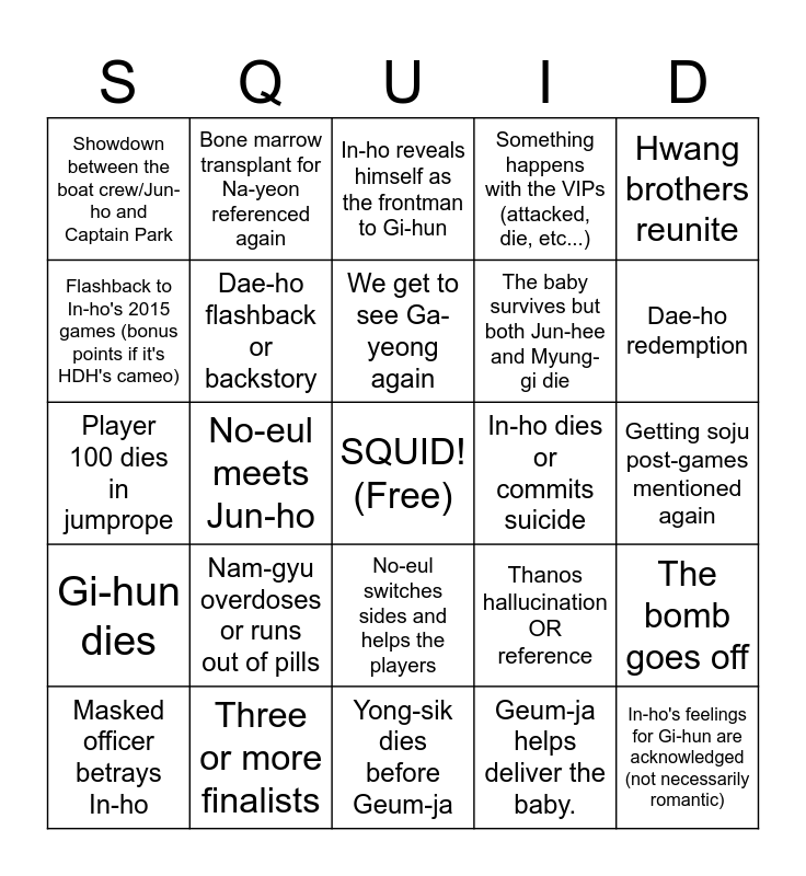 This bingo card has a free space and 24 words: Nam-gyu overdoses or runs out of pills, Three or more finalists, We get to see Ga-yeong again, Masked officer betrays In-ho, Hwang brothers reunite, Showdown between the boat crew/Jun-ho and Captain Park, Flashback to In-ho's 2015 games (bonus points if it's HDH's cameo), Bone marrow transplant for Na-yeon referenced again, In-ho dies or commits suicide, No-eul switches sides and helps the players, The baby survives but both Jun-hee and Myung-gi die, Player 100 dies in jumprope, Thanos hallucination OR reference, The bomb goes off, Dae-ho flashback or backstory, Geum-ja helps deliver the baby., Getting soju post-games mentioned again, In-ho reveals himself as the frontman to Gi-hun, Dae-ho redemption, No-eul meets Jun-ho, In-ho's feelings for Gi-hun are acknowledged (not necessarily romantic), Gi-hun dies, Something happens with the VIPs (attacked, die, etc...) and Yong-sik dies before Geum-ja.