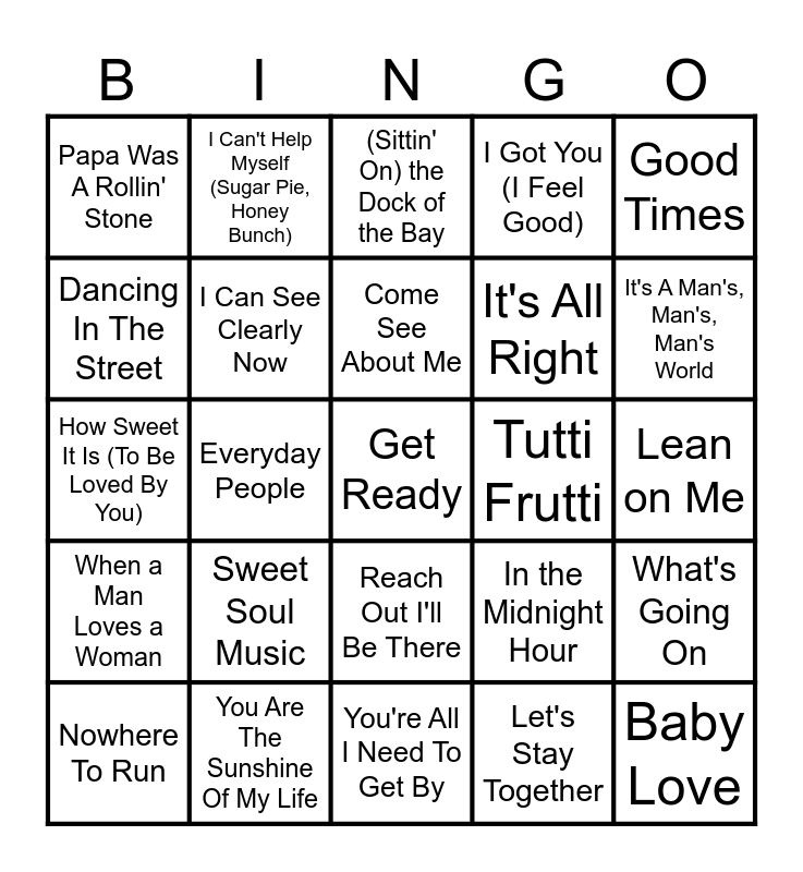 This bingo card has 76 words: Free!, (Love Is Like A) Heat Wave, (Sittin' On) the Dock of the Bay, (You Make Me Feel Like) A Natural Woman, (Your Love Keeps Lifting Me) Higher & Higher, A Change Is Gonna Come, Ain't No Sunshine, Ain't Too Proud To Beg, As, At Last, Baby Love, Bring It On Home to Me, Come See About Me, Dancing In The Street, Do You Love Me, Everyday People, For Once In My Life, Get Ready, Get Up Offa That Thing, Good Times, Hold on, I'm Comin', How Sweet It Is (To Be Loved By You), I Can See Clearly Now, I Can't Help Myself (Sugar Pie, Honey Bunch), I Got You (I Feel Good), I Heard It Through The Grapevine, I Only Have Eyes for You, I Put A Spell On You, I Want You Back, I'd Rather Go Blind, If You Don't Know Me By Now, I'll Take You There, I'm Your Puppet, In the Midnight Hour, It's A Man's, Man's, Man's World, It's All Right, Just My Imagination (Running Away With Me), Knock on Wood, Lean on Me, Let's Stay Together, Love Train, Lovin' You, Move on Up, Mustang Sally, My Girl, My Guy, Nowhere To Run, Papa Was A Rollin' Stone, Papa's Got A Brand New Bag, Please Mr. Postman, Proud Mary, Reach Out I'll Be There, Respect, Signed, Sealed, Delivered (I'm Yours), Something's Got A Hold On Me, Soul Man, Stand by Me, Stuck On You, Super Freak, Superstition, Sweet Soul Music, Tears of a Clown, The Tracks Of My Tears, This Old Heart Of Mine (Is Weak For You), This Will Be (An Everlasting Love), Try a Little Tenderness, Tutti Frutti, Twenty Five Miles, Uptight (Everything's Alright), War, What's Going On, When a Man Loves a Woman, You Are The Sunshine Of My Life, You Can't Hurry Love, You're All I Need To Get By and You've Really Got A Hold On Me.