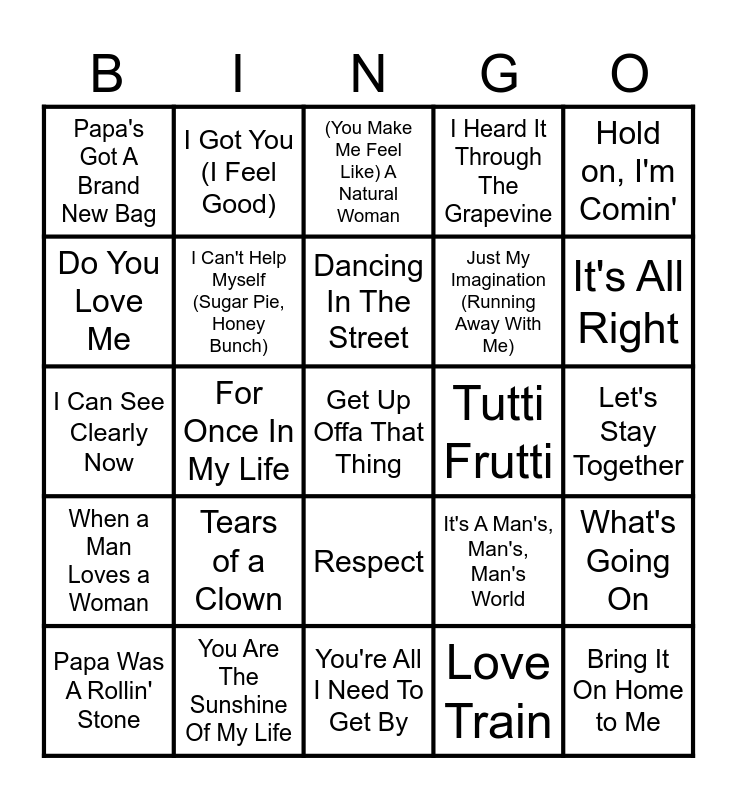 This bingo card has 75 words: (Love Is Like A) Heat Wave, (Sittin' On) the Dock of the Bay, (You Make Me Feel Like) A Natural Woman, (Your Love Keeps Lifting Me) Higher & Higher, A Change Is Gonna Come, Ain't No Sunshine, Ain't Too Proud To Beg, As, At Last, Baby Love, Bring It On Home to Me, Come See About Me, Dancing In The Street, Do You Love Me, Everyday People, For Once In My Life, Get Ready, Get Up Offa That Thing, Good Times, Hold on, I'm Comin', How Sweet It Is (To Be Loved By You), I Can See Clearly Now, I Can't Help Myself (Sugar Pie, Honey Bunch), I Got You (I Feel Good), I Heard It Through The Grapevine, I Only Have Eyes for You, I Put A Spell On You, I Want You Back, I'd Rather Go Blind, If You Don't Know Me By Now, I'll Take You There, I'm Your Puppet, In the Midnight Hour, It's A Man's, Man's, Man's World, It's All Right, Just My Imagination (Running Away With Me), Knock on Wood, Lean on Me, Let's Stay Together, Love Train, Lovin' You, Move on Up, Mustang Sally, My Girl, My Guy, Nowhere To Run, Papa Was A Rollin' Stone, Papa's Got A Brand New Bag, Please Mr. Postman, Proud Mary, Reach Out I'll Be There, Respect, Signed, Sealed, Delivered (I'm Yours), Something's Got A Hold On Me, Soul Man, Stand by Me, Stuck On You, Super Freak, Superstition, Sweet Soul Music, Tears of a Clown, The Tracks Of My Tears, This Old Heart Of Mine (Is Weak For You), This Will Be (An Everlasting Love), Try a Little Tenderness, Tutti Frutti, Twenty Five Miles, Uptight (Everything's Alright), War, What's Going On, When a Man Loves a Woman, You Are The Sunshine Of My Life, You Can't Hurry Love, You're All I Need To Get By and You've Really Got A Hold On Me.