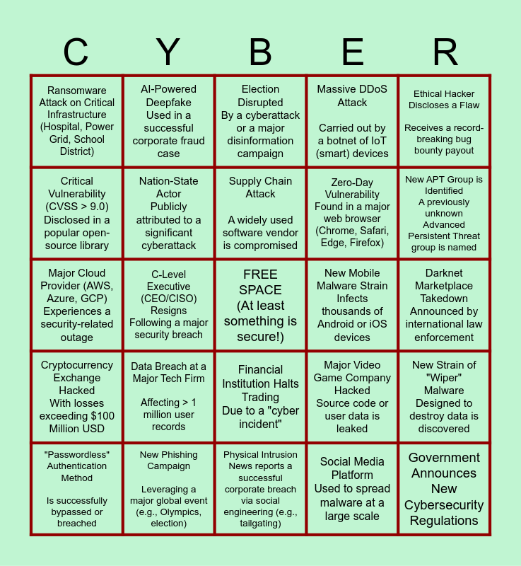 This bingo card has a free space and 24 words: Data Breach at a Major Tech Firm Affecting > 1 million user records, New Phishing Campaign Leveraging a major global event (e.g., Olympics, election), Supply Chain Attack A widely used software vendor is compromised, "Passwordless" Authentication Method Is successfully bypassed or breached, Ethical Hacker Discloses a Flaw Receives a record-breaking bug bounty payout, Ransomware Attack on Critical Infrastructure (Hospital, Power Grid, School District), Critical Vulnerability (CVSS > 9.0) Disclosed in a popular open-source library, AI-Powered Deepfake Used in a successful corporate fraud case, New Mobile Malware Strain Infects thousands of Android or iOS devices, Financial Institution Halts Trading Due to a "cyber incident", Zero-Day Vulnerability Found in a major web browser (Chrome, Safari, Edge, Firefox), Major Cloud Provider (AWS, Azure, GCP) Experiences a security-related outage, Major Video Game Company Hacked Source code or user data is leaked, New Strain of "Wiper" Malware Designed to destroy data is discovered, Nation-State Actor Publicly attributed to a significant cyberattack, Social Media Platform Used to spread malware at a large scale, Darknet Marketplace Takedown Announced by international law enforcement, Election Disrupted By a cyberattack or a major disinformation campaign, New APT Group is Identified A previously unknown Advanced Persistent Threat group is named, C-Level Executive (CEO/CISO) Resigns Following a major security breach, Government Announces New Cybersecurity Regulations, Cryptocurrency Exchange Hacked With losses exceeding $100 Million USD, Massive DDoS Attack Carried out by a botnet of IoT (smart) devices and Physical Intrusion News reports a successful corporate breach via social engineering (e.g., tailgating).