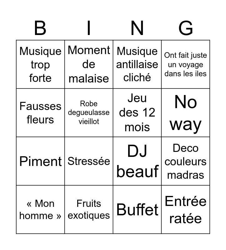 This bingo card has 16 words: Fruits exotiques, Deco couleurs madras, Musique antillaise cliché, Musique trop forte, Piment, Moment de malaise, DJ beauf, Buffet, Fausses fleurs, Robe degueulasse vieillot, « Mon homme », Ont fait juste un voyage dans les iles, Stressée, No way, Jeu des 12 mois and Entrée ratée.