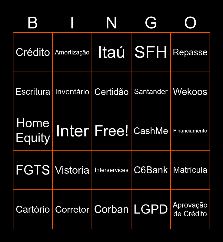 This bingo card has a free space and 69 words: BPO, Financiamento, Imóvel, Imobiliária, Corretor, SFI, SFH, SLA, Repasse, Consórcio, Matrícula, ANAC, Crédito, Itaú, Bradesco, Inter, Interservices, Santander, Caixa, FGTS, CashMe, C6Bank, Wekoos, Uicos, Imóvel Foreiro, SAC, Price, Financiamento de Terreno, LGPD, Averbação, Amortização, Tutela, Imposto de Renda, Selic, Regime de Bens, Composição de Renda, Registro, ITBI, Escritura, Banco, Vistoria, Aprovação de Crédito, Análise de Crédito, Simulação, Renda, Cartório, Curatela, Alvará, Espólio, Inventário, Certidão, Documento, Correspondente Bancário, Corban, Habite-se, Memorando, Memorial Descritivo, Construtora, Incorporadora, Home Equity, IQ, Juros, CET, Portabilidade, Thiago Love, Nairkoos, Desculpa Lari, Portal and Abecip.