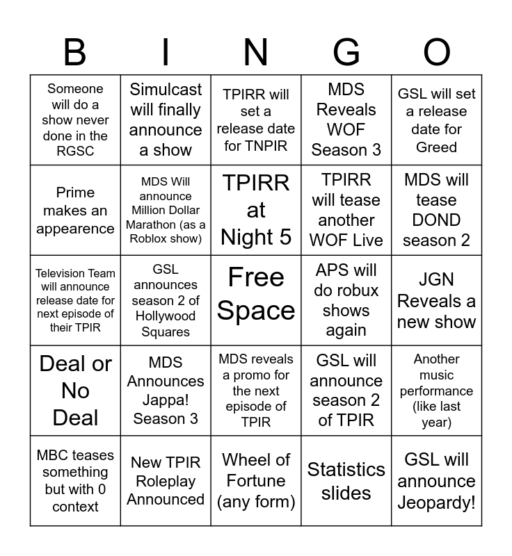 This bingo card has a free space and 24 words: MDS Announces Jappa! Season 3, New TPIR Roleplay Announced, TPIRR at Night 5, MBC teases something but with 0 context, GSL will set a release date for Greed, Someone will do a show never done in the RGSC, Prime makes an appearence, Simulcast will finally announce a show, APS will do robux shows again, MDS reveals a promo for the next episode of TPIR, TPIRR will tease another WOF Live, Television Team will announce release date for next episode of their TPIR, GSL will announce season 2 of TPIR, Another music performance (like last year), MDS Will announce Million Dollar Marathon (as a Roblox show), Statistics slides, JGN Reveals a new show, TPIRR will set a release date for TNPIR, MDS will tease DOND season 2, GSL announces season 2 of Hollywood Squares, GSL will announce Jeopardy!, Deal or No Deal, MDS Reveals WOF Season 3 and Wheel of Fortune (any form).