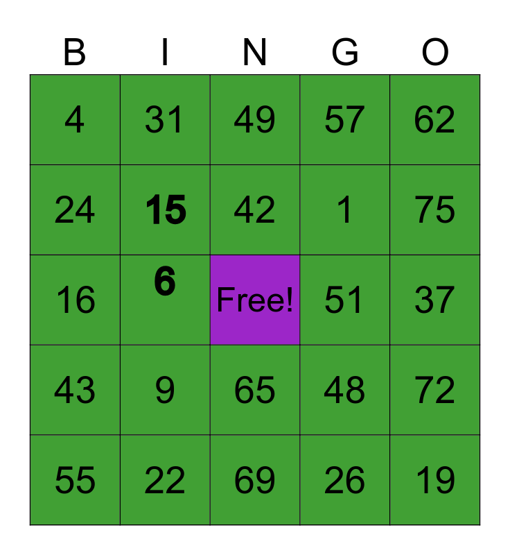 This bingo card has a free space and 24 words: 9, 22, 42, 55, 62, 4, 24, 31, 51, 65, 1, 16, 48, 72, 15, 26, 37, 49, 75, 6, 19, 43, 57 and 69.