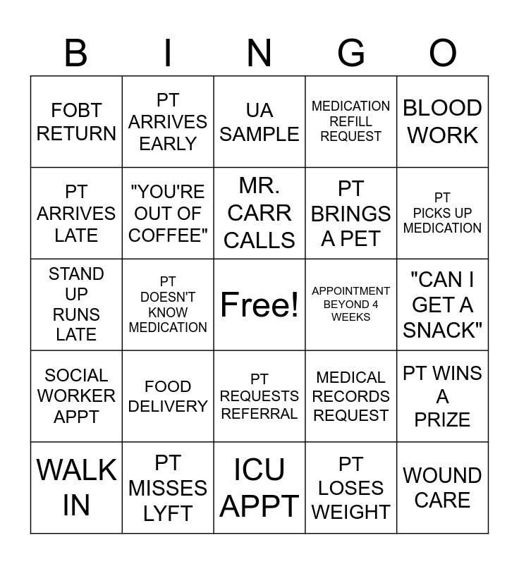 This bingo card has a free space and 24 words: FOOD DELIVERY, PT MISSES LYFT, MR. CARR CALLS, WALK IN, BLOOD WORK, FOBT RETURN, PT ARRIVES LATE, PT ARRIVES EARLY, APPOINTMENT BEYOND 4 WEEKS, PT REQUESTS REFERRAL, PT BRINGS A PET, STAND UP RUNS LATE, MEDICAL RECORDS REQUEST, PT WINS A PRIZE, "YOU'RE OUT OF COFFEE", PT LOSES WEIGHT, "CAN I GET A SNACK", UA SAMPLE, PT PICKS UP MEDICATION, PT DOESN'T KNOW MEDICATION, WOUND CARE, SOCIAL WORKER APPT, MEDICATION REFILL REQUEST and ICU APPT.