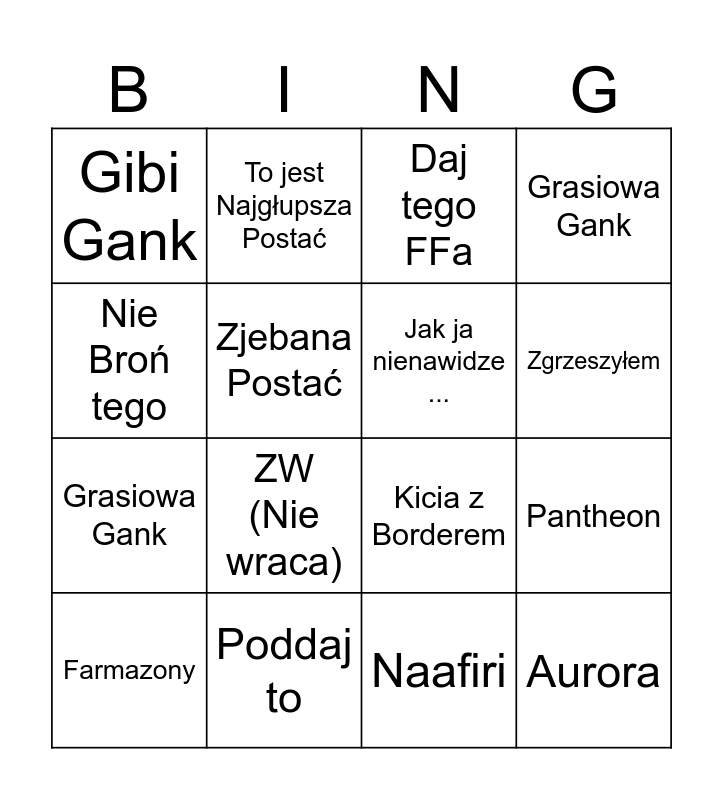 This bingo card has 20 words: Pantheon, Akshan, Daj tego FFa, D55cia, Farmazony, Nie Broń tego, Poddaj to, Gibi Gank, Grasiowa Gank, To jest Najgłupsza Postać, ZW (Nie wraca), Kicia z Borderem, Zjebana Postać, Aurora, Jak ja nienawidze ..., Ja mam dość na dziś ..., Zgrzeszyłem, Grasiowa Gank, Naafiri and Nie broń tego.