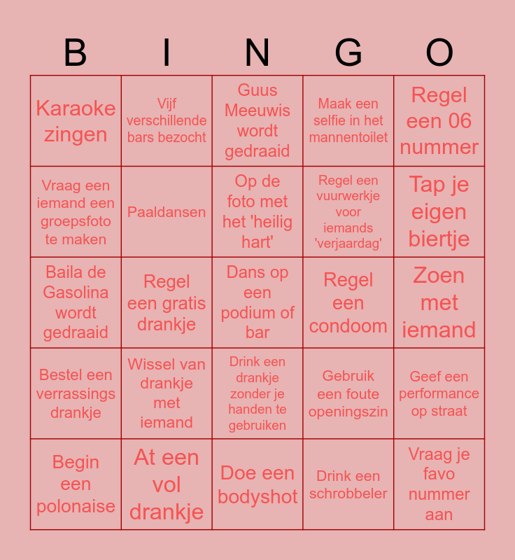 This bingo card has 30 words: At een vol drankje, Shotje met een vreemde, Regel een gratis drankje, Maak een selfie met een vreemde, Karaoke zingen, Guus Meeuwis wordt gedraaid, Paaldansen, Drink een drankje zonder je handen te gebruiken, Regel een condoom, Doe een bodyshot, Zoen met iemand, Dans op een podium of bar, Drink een schrobbeler, Vraag je favo nummer aan, Tap je eigen biertje, Scoor een kledingstuk/attribuut, Gebruik een foute openingszin, Bestel een verrassings drankje, Wissel van drankje met iemand, Regel een 06 nummer, Baila de Gasolina wordt gedraaid, Daag een vreemde uit voor 'truth or dare', Vijf verschillende bars bezocht, Regel een vuurwerkje voor iemands 'verjaardag', Vraag een iemand een groepsfoto te maken, Maak een selfie in het mannentoilet, Geef een performance op straat, Begin een polonaise, Op de foto met het 'heilig hart' and Haal een drankje voor FC lid.
