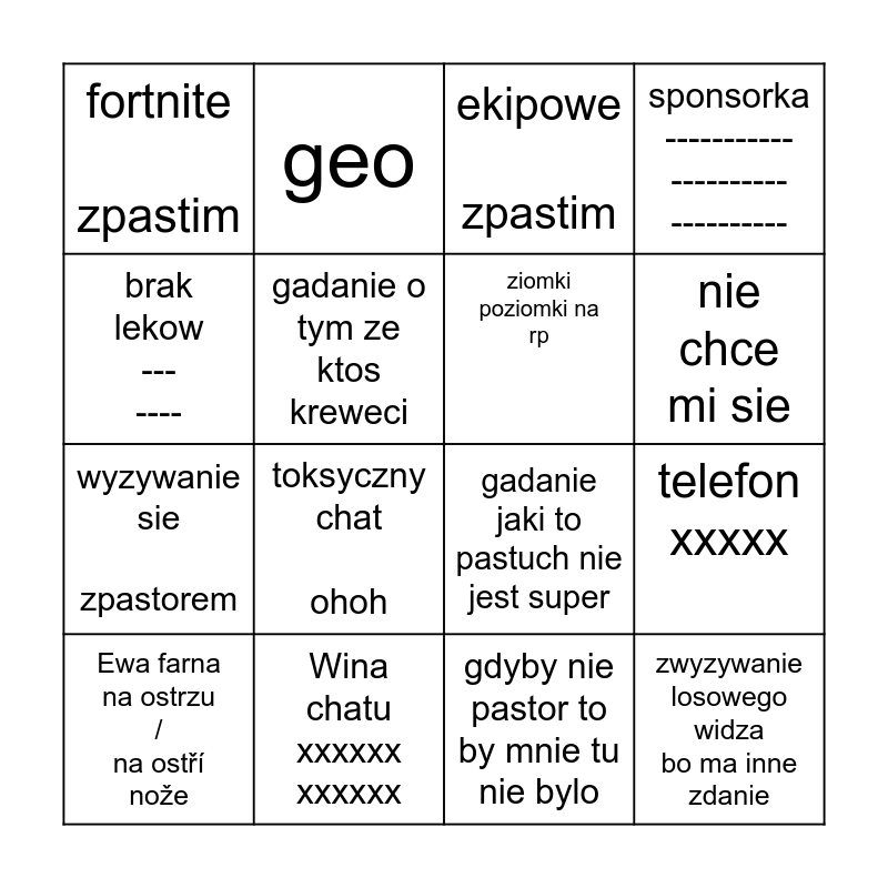 This bingo card has 16 words: Wina chatu xxxxxx xxxxxx, telefon xxxxx, ekipowe zpastim, fortnite zpastim, wyzywanie sie zpastorem, geo, gadanie jaki to pastuch nie jest super, gdyby nie pastor to by mnie tu nie bylo, brak lekow --- ----, gadanie o tym ze ktos kreweci, Ewa farna na ostrzu / na ostří nože, sponsorka ----------- ---------- ----------, toksyczny chat ohoh, nie chce mi sie, ziomki poziomki na rp and zwyzywanie losowego widza bo ma inne zdanie.
